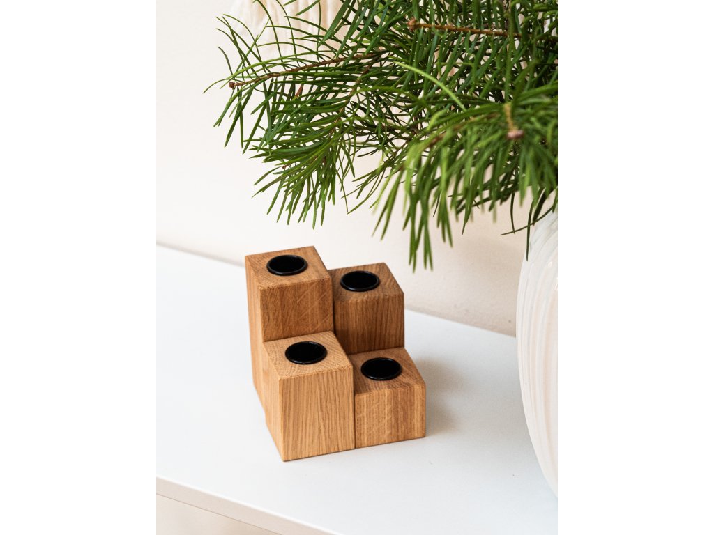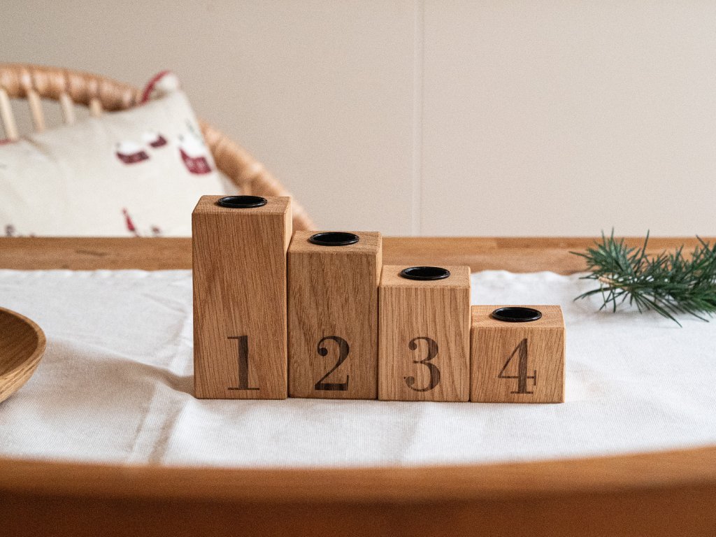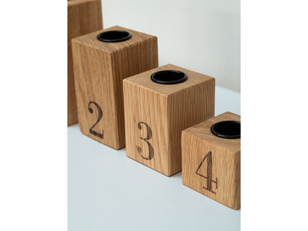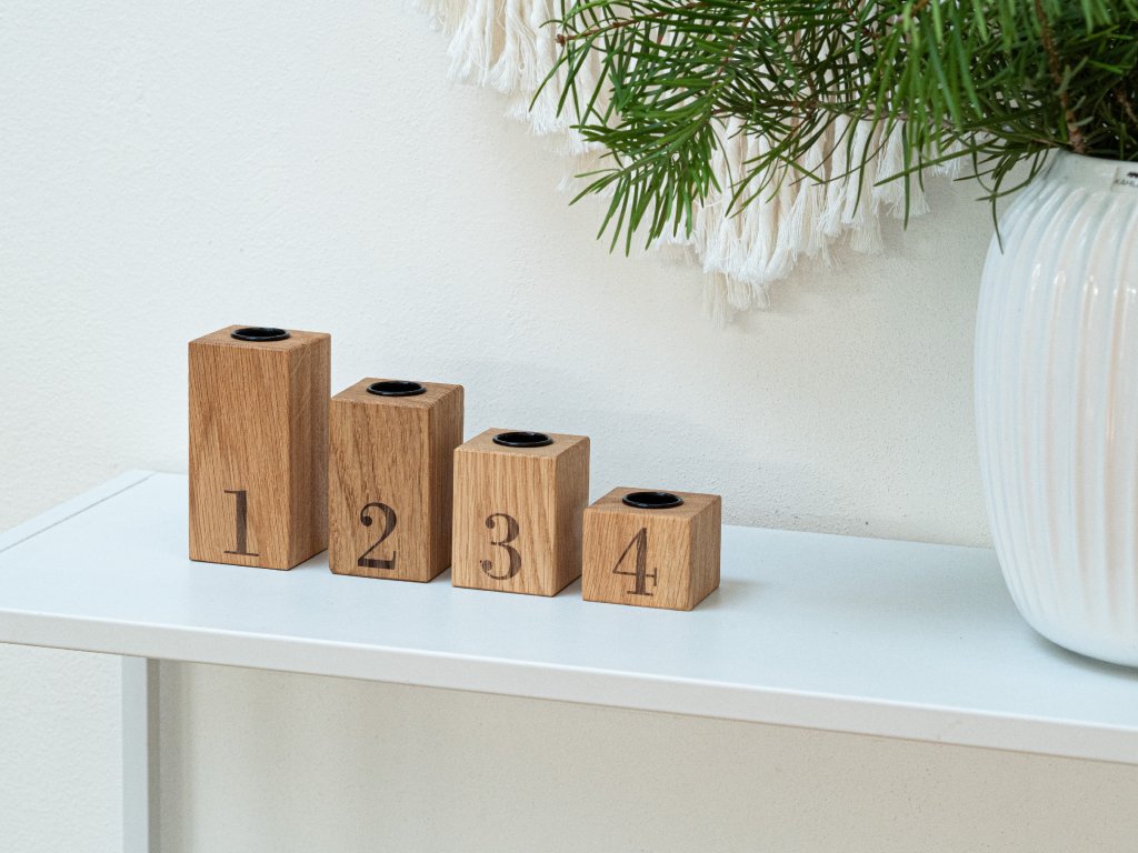 Originální dubový svícen složený ze čtyř hranolů s vyznačenými čísly symbolizujícími čtyři adventní neděle. Jednoduchý, variabilní a nadčasový kousek, který vám bude dělat radost nejen během adventu, ale i po celý rok.