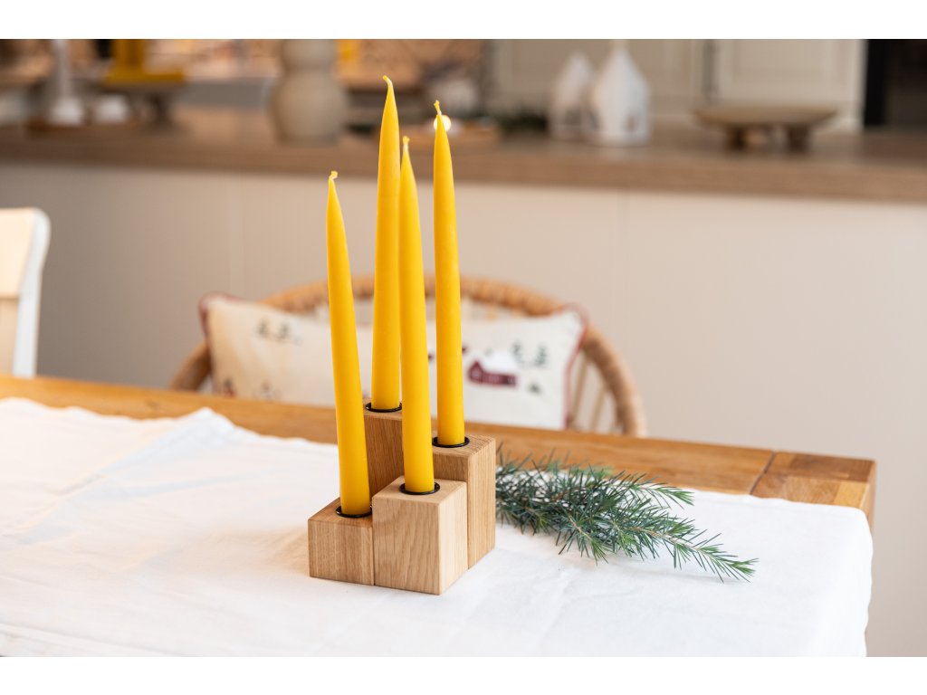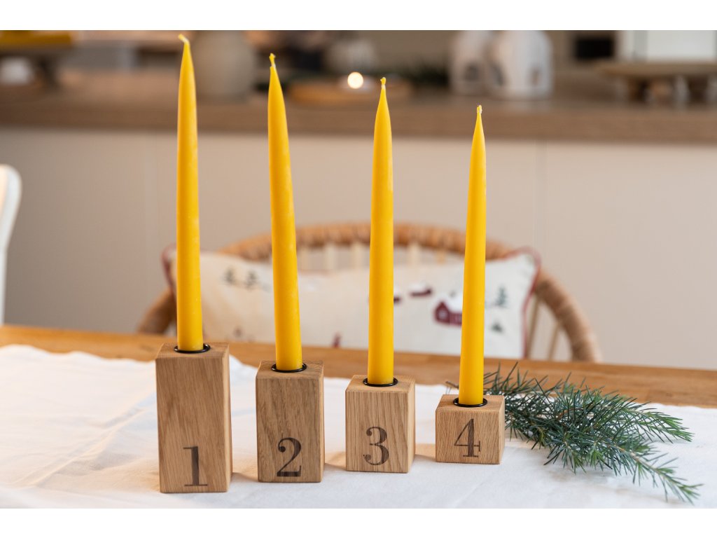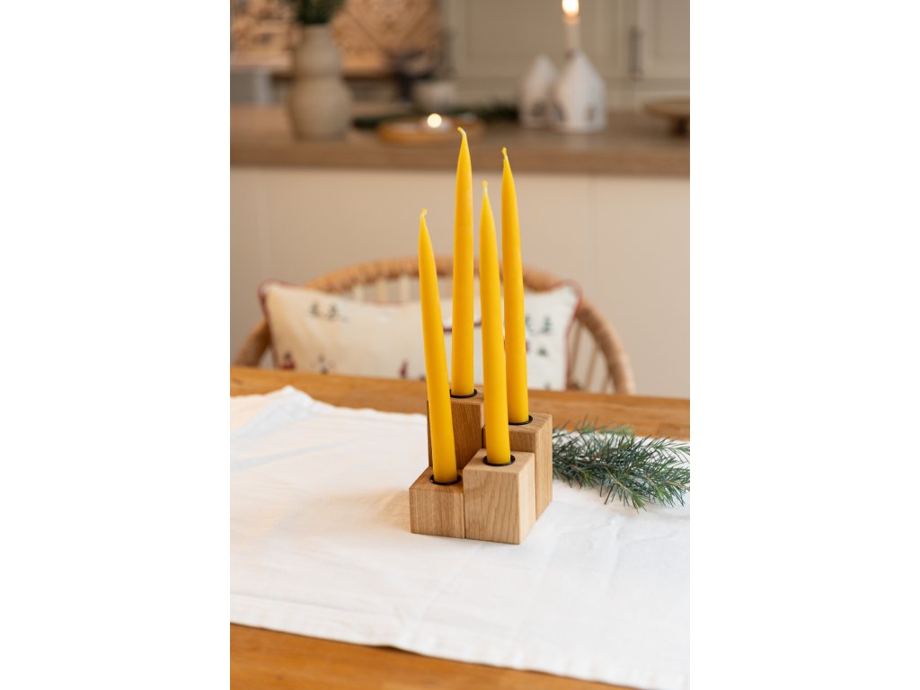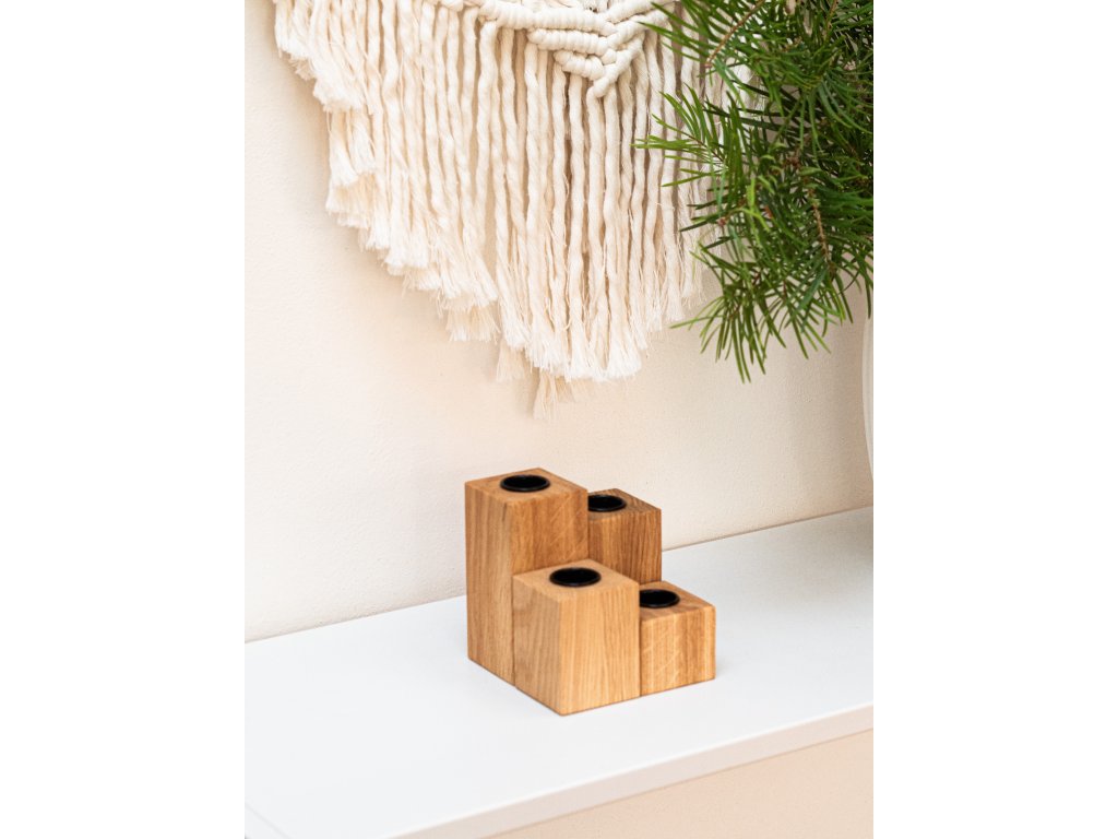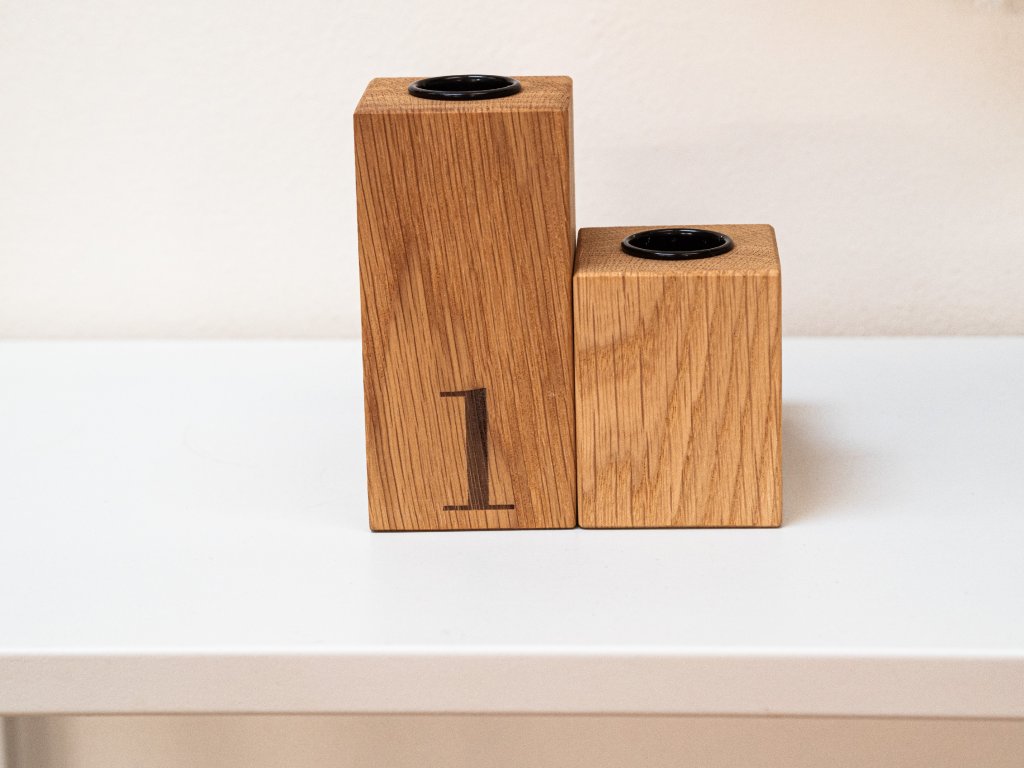 Originální dubový svícen složený ze čtyř hranolů s vyznačenými čísly symbolizujícími čtyři adventní neděle. Jednoduchý, variabilní a nadčasový kousek, který vám bude dělat radost nejen během adventu, ale i po celý rok.