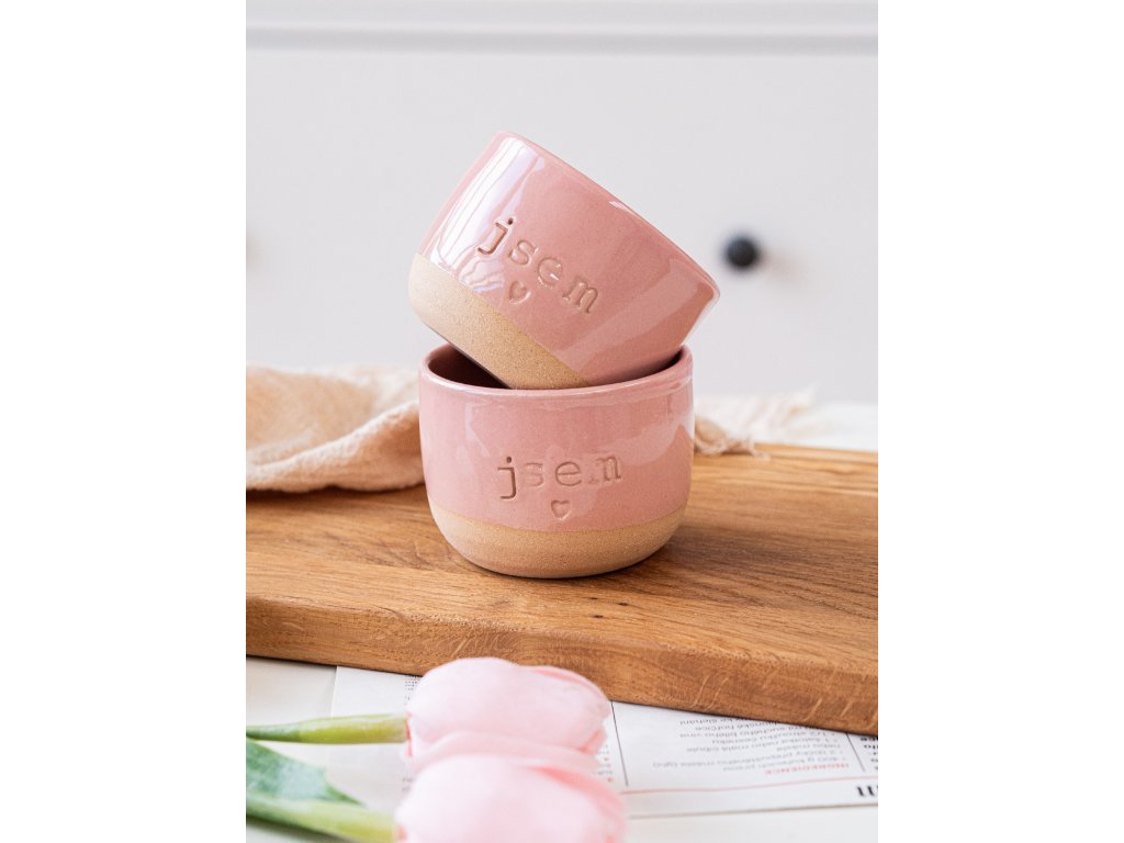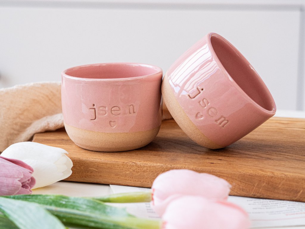 Růžový kalíšek s nápisem JSEM a srdíčkem Tě zahřeje pokaždé, když jej použiješ. Každé ručně vyražené písmenko je symbolem lásky k řemeslu, ruční výrobě, ale taky k sobě. Protože abych mohli lásku rozdávat, musíme si ji umět dávat.