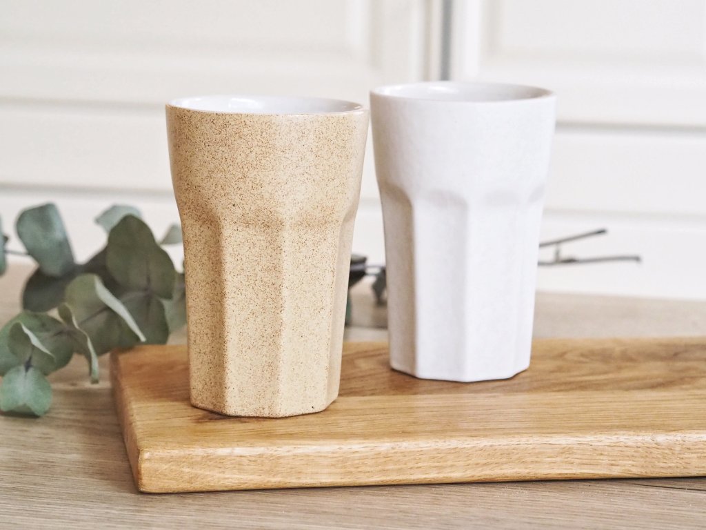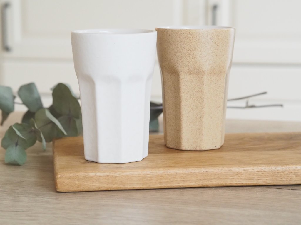 Keramický ručně odlévány pohár v bílé a pískové barvě