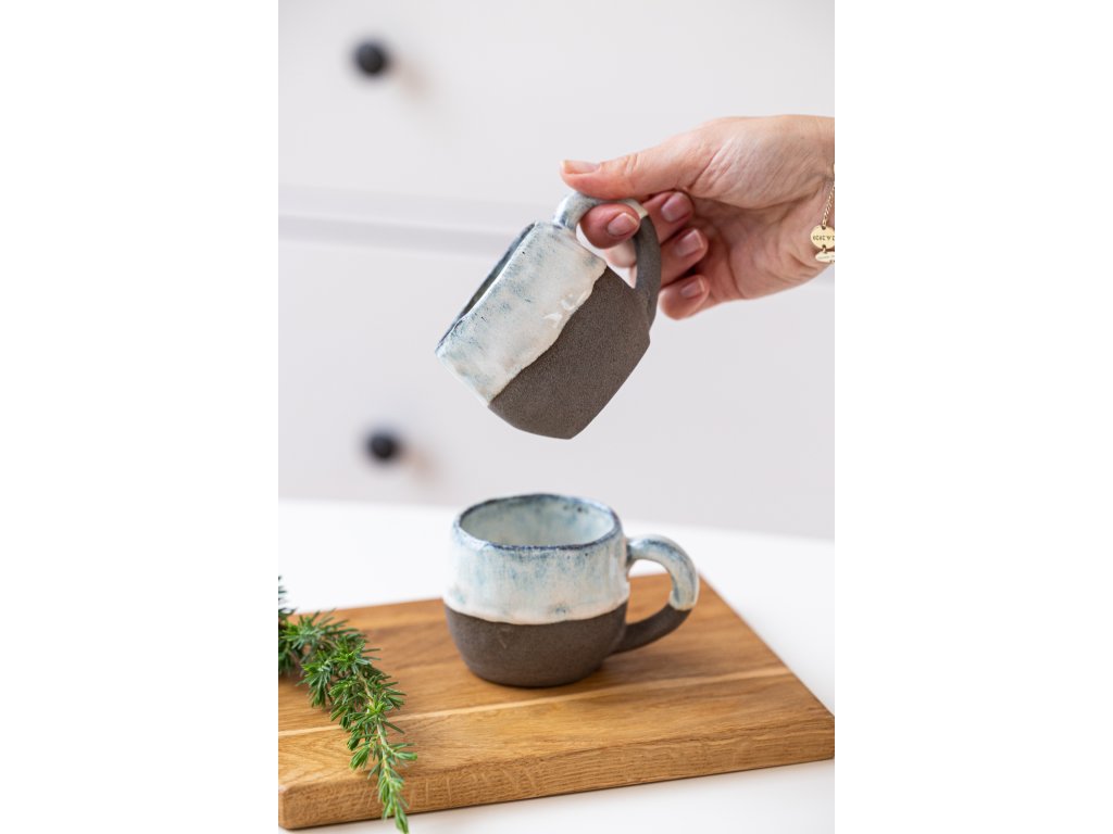 Ručně mačkaný keramický hrníček Bali s modrobílou glazurou připomínající moře. Originální, nepravidelný tvar a poctivá ruční práce.