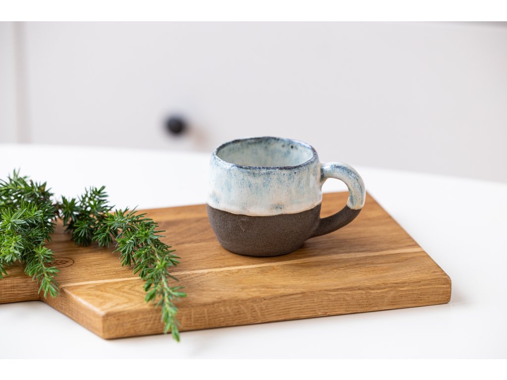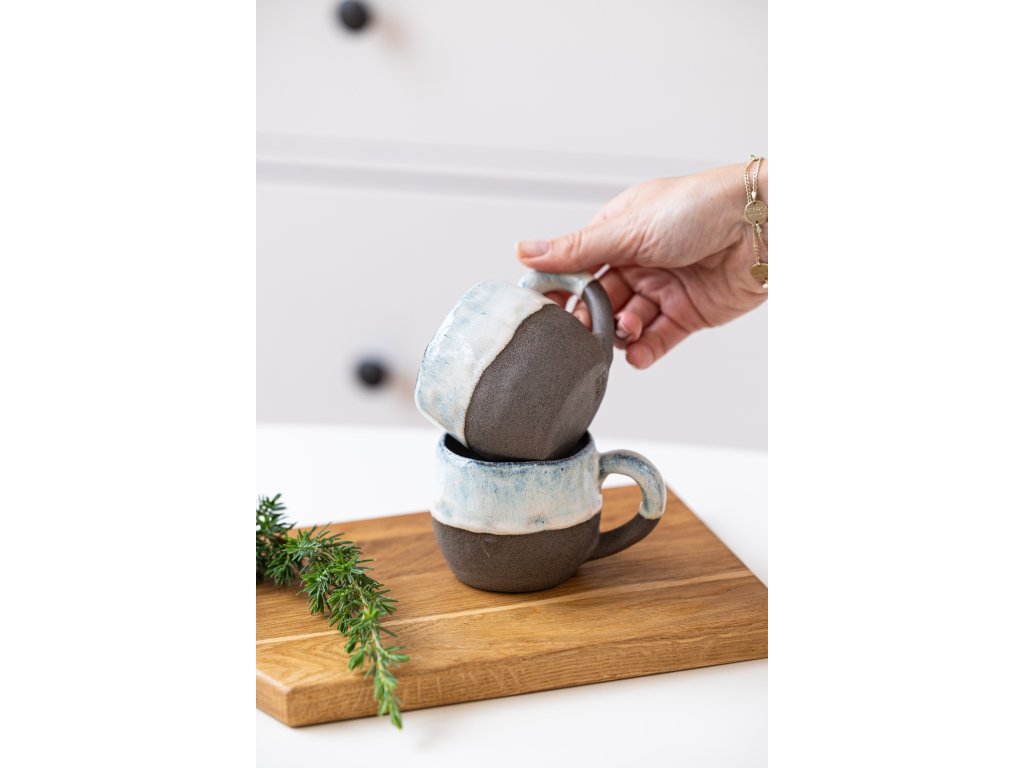 Hrníček, který nese otisk rukou svého tvůrce. Každý kousek je originál, vznikl ručním mačkáním hlíny, díky čemuž má přirozeně nepravidelný tvar a jedinečný charakter.