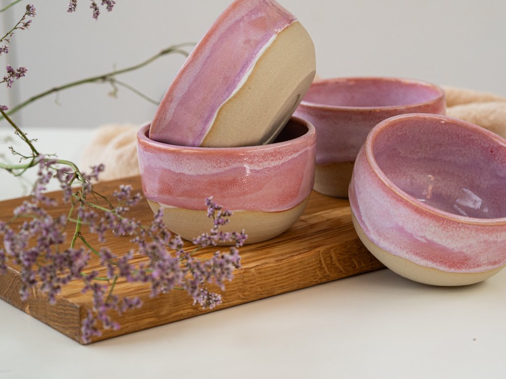 Ručně vyrobený keramický kalíšek růžová/modrá/bílá