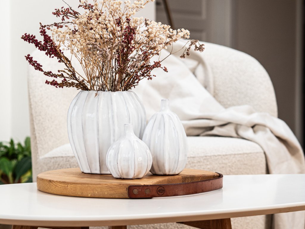 Velkou bílou keramickou dýni – nadčasová dekorace, která dodá interiéru útulnou podzimní atmosféru.