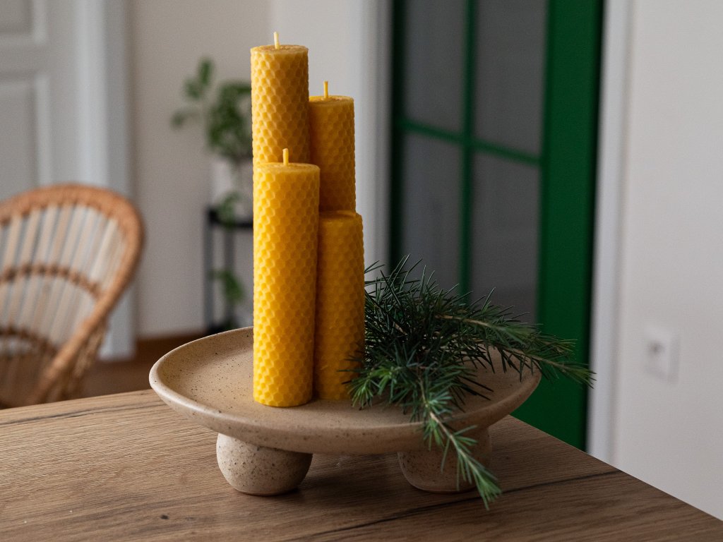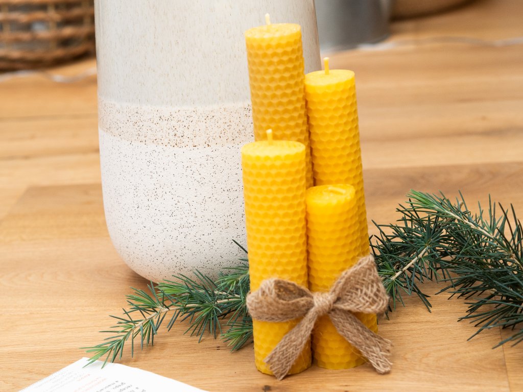 Podtrhněte kouzlo adventního času přírodními svíčkami ze 100% včelího vosku. Jejich jemná medová vůně a zlatavý odstín krásně ladí s jehličím i minimalistickým aranžmá. Díky odstupňované velikosti se sada hodí na adventní věnec, ale svíčky vyniknou i samostatně – třeba na keramickém podnosu nebo svícnu.