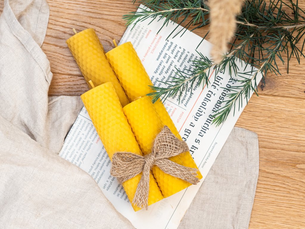 Adventní sada 4 ks svíček ze 100% včelího vosku. Jemná medová vůně, čisté hoření a přírodní vzhled pro váš věnec či sváteční výzdobu.
